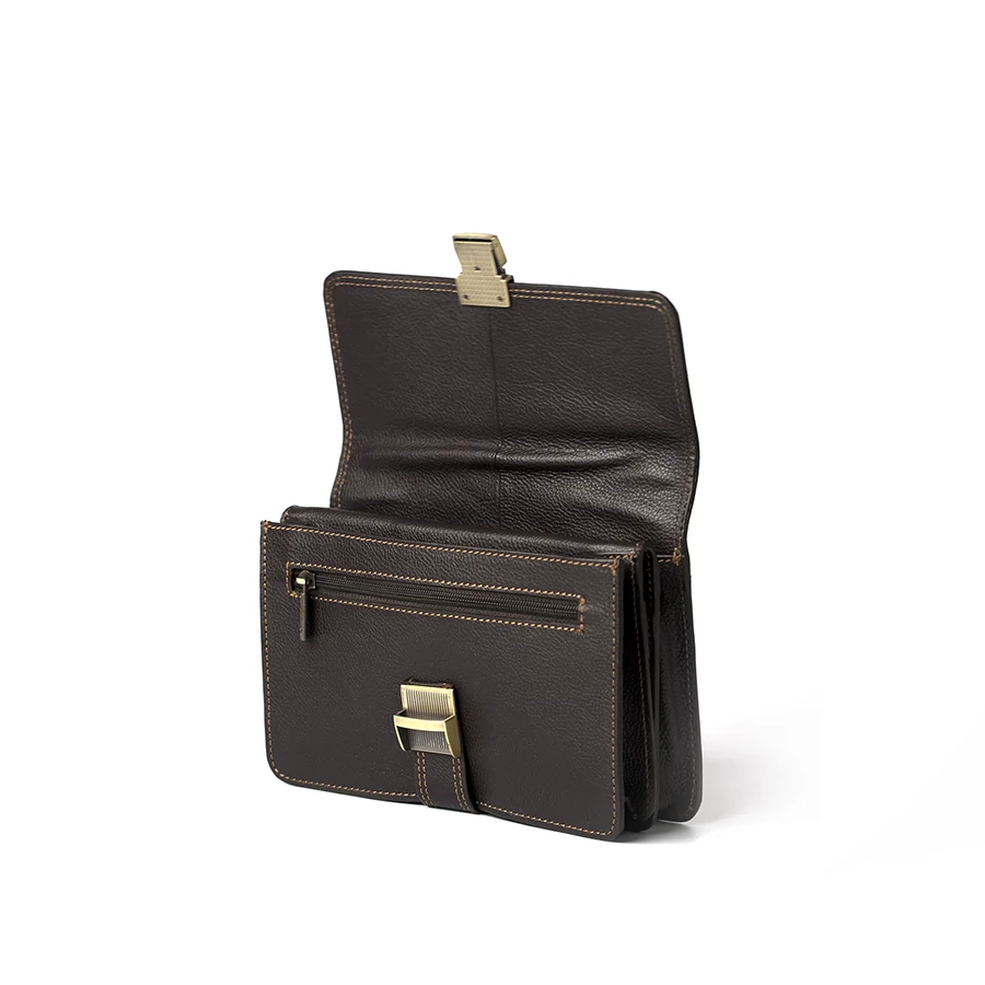 A felső rész elválasztóval és cipzáras zsebekkel, az alsó rész pedig kártya-, igazolvány- és irattartó rekeszekkel segíti az átlátható rendszerezést. Kényelmes bőr kézifüllel készült.