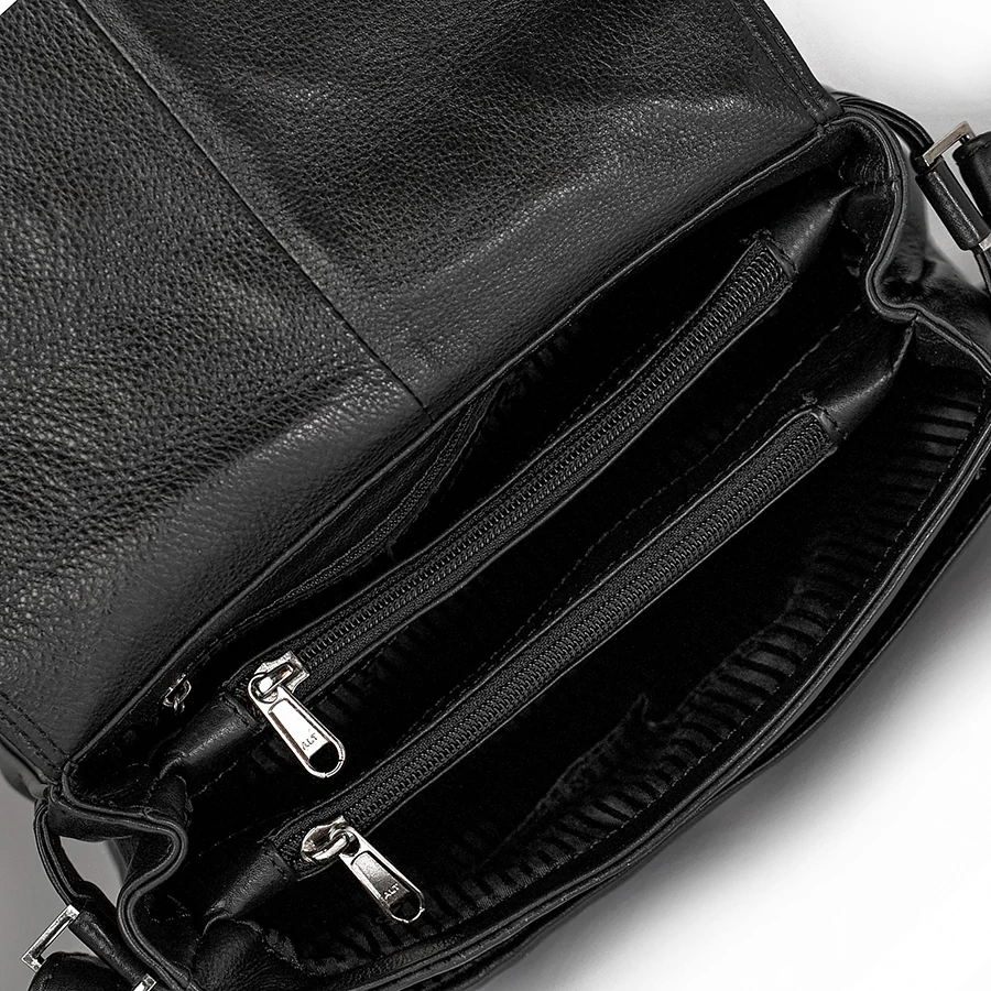 Az osztott belső tér két külön cipzáras rekesszel segíti a rendezett tárolást. A belső oldalon egy cipzáras zseb és egy külön telefontartó kapott helyet. Az elülső részen egy ráhajtható fakk mágneses záródással, míg a hátoldalon egy cipzáras zseb biztosít gyors hozzáférést a legfontosabb tárgyakhoz.