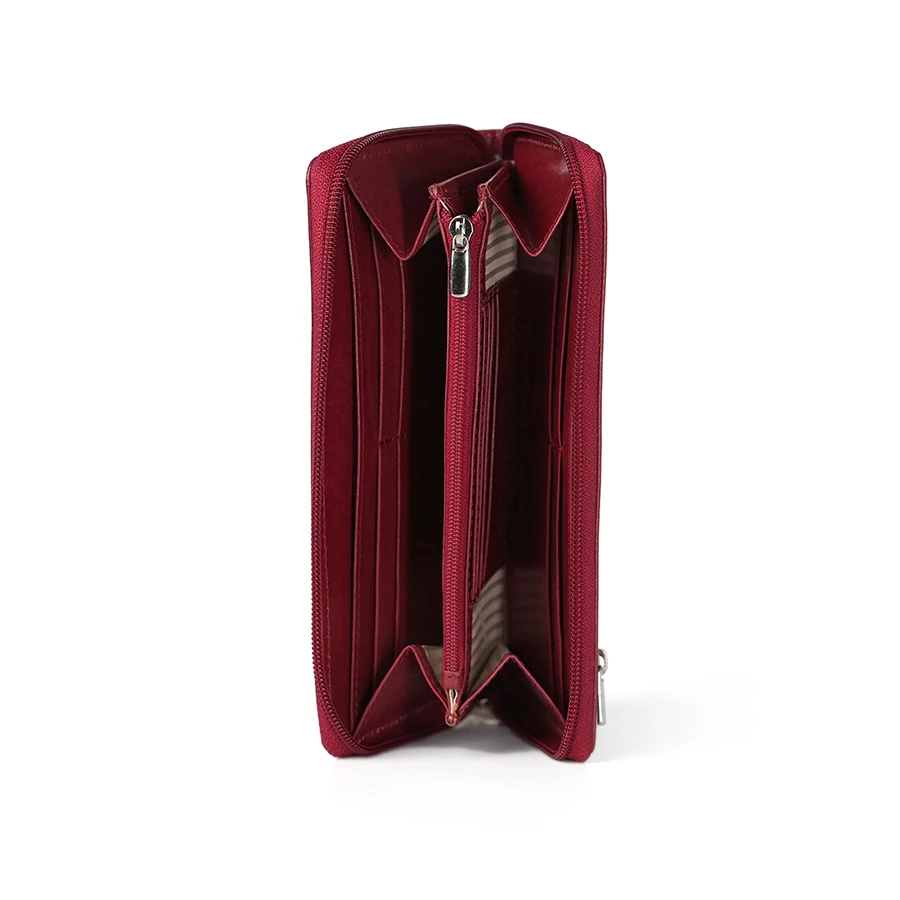 Cipzárral zárható kialakítása biztonságot nyújt, belsejében pedig két nagyméretű rekesz található. A számos kártya- és igazolványtartó gondoskodik a rendezett elrendezésről, míg a belső cipzáras zseb ideális az aprópénz számára. A belső selyembélés elegáns megjelenést és kellemes használatot biztosít.