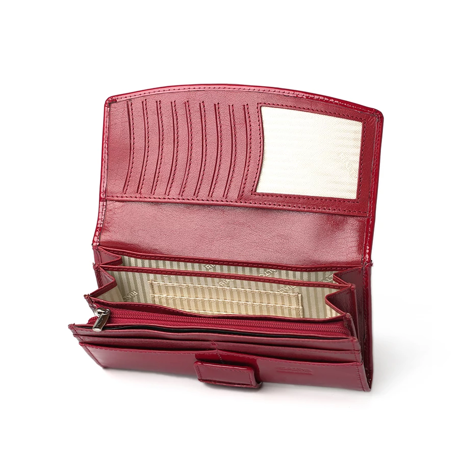 Az elöl patenttal záródó belső rész több rekesszel rendelkezik, így bőséges helyet biztosít bankjegyek, kártyák és dokumentumok számára. Az átlátszó igazolványtartó megkönnyíti a gyors használatot, míg az aprót külön cipzáras rekesz tartja biztonságban. A pénztárca hátoldalán található külön cipzáras biztonsági zseb extra védelmet nyújt a fontosabb értékek számára.