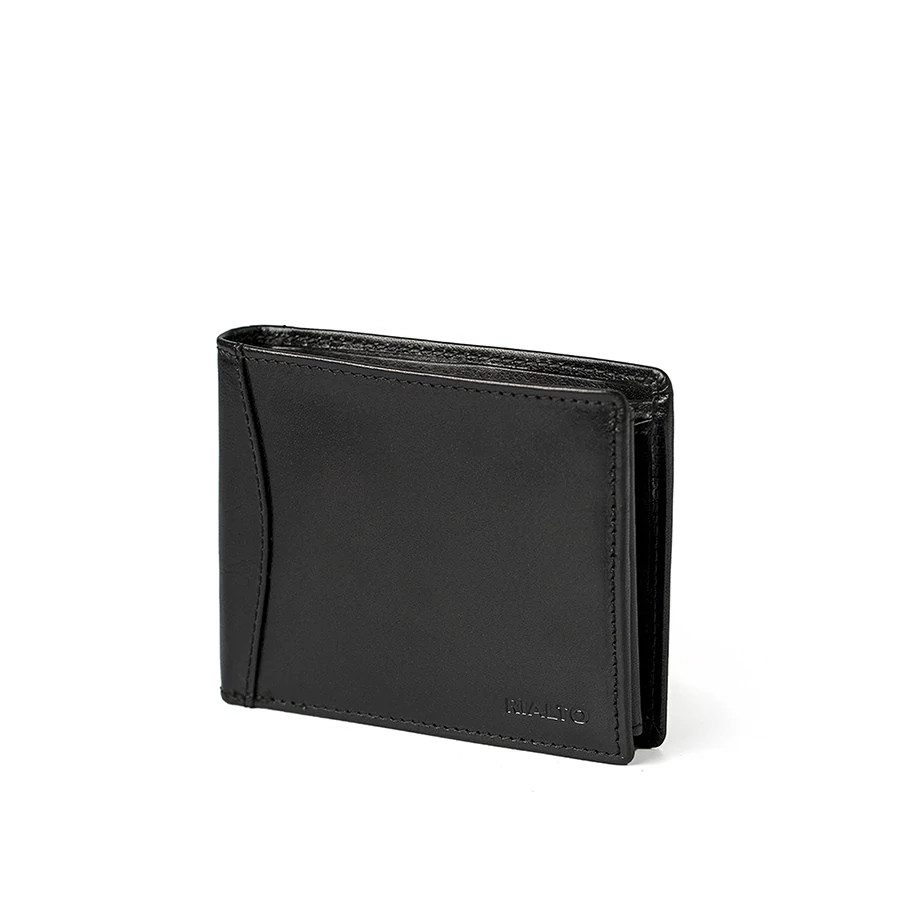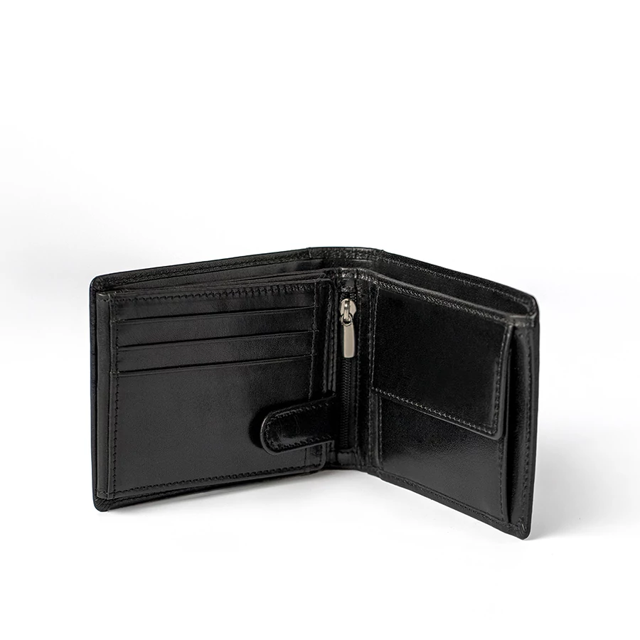 Klasszikus férfi bőr pénztárca többfakkos belső kialakítással, kártya- és igazolványtartókkal, cipzáras biztonsági rekesszel és patentos aprópénztartóval.