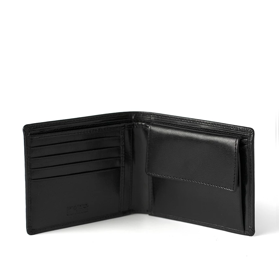 Klasszikus férfi bőr pénztárca többfakkos belső kialakítással, számos kártya- és igazolványtartóval. Külön, patenttal zárható aprópénztartóval.